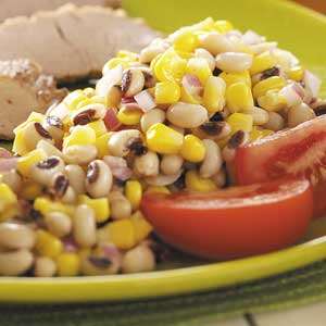 Ingredients: 1-15 oz. can black-eyed peas, drained and rinsed 1-10 oz. package frozen corn kernels, thawed 2 Tbsp. pimento peppers, chopped 1/2 c. celery, chopped 2 Tbsp. dried minced onion…